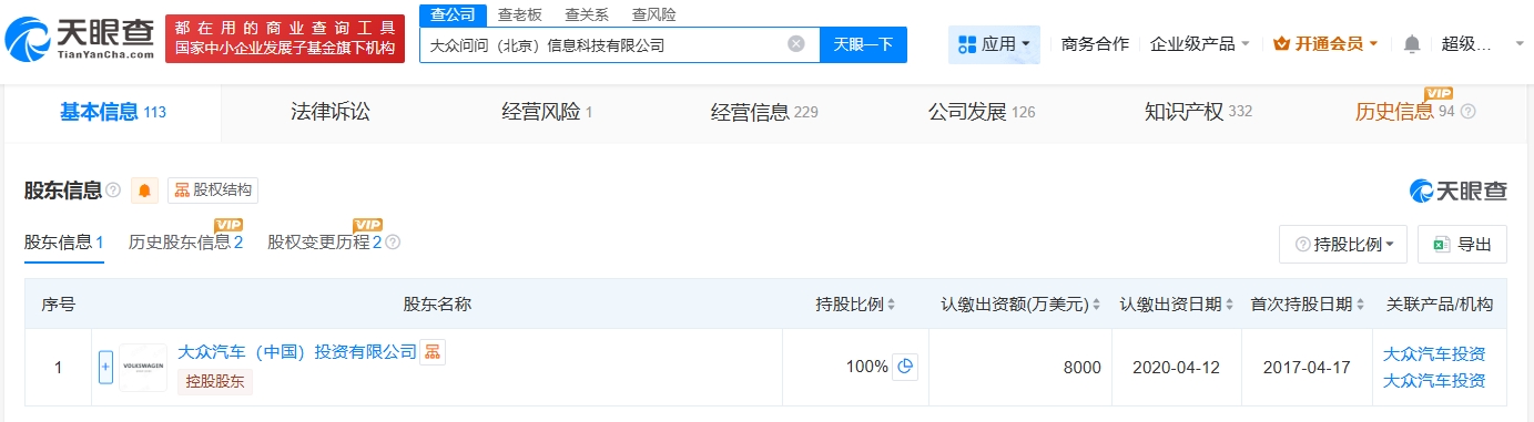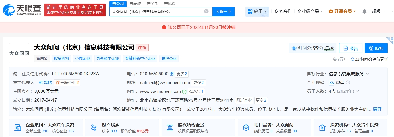每经AI快讯,天眼查App显示,近日,大众问问(北京)信息科技有限公司登记状态由存续变更为注销。此前,该公司已发布注销备案公告。该公司成立于2017年4月,法定代表人为韩鸿铭,注册资本8000万美元,经营范围包括人工智能基础软件开发、汽车零部件及配件制造、数据处理和存储支持服务、电子元器件制造等。股东信息显示,该公司由大众汽车(中国)投资有限公司全资持股。