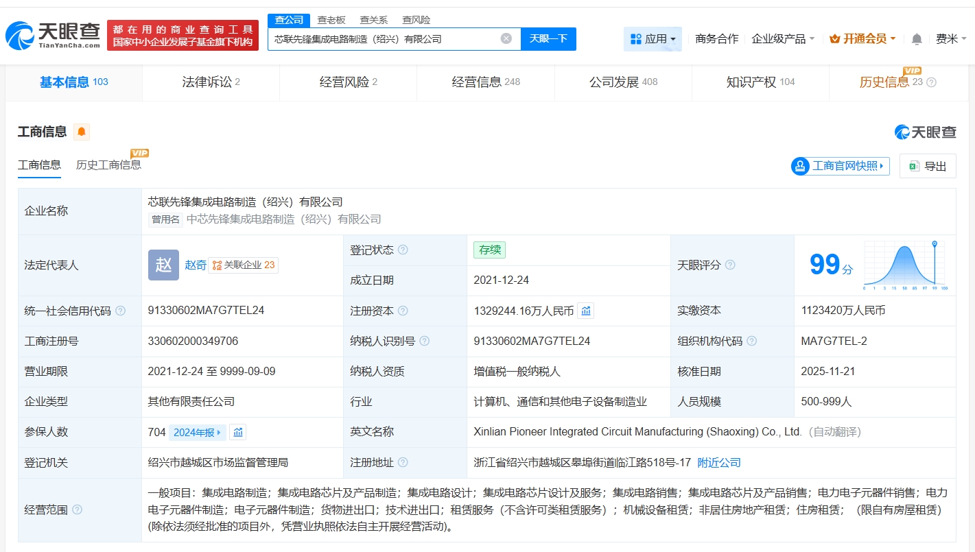 每经AI快讯,天眼查工商信息显示,近日,芯联先锋集成电路制造(绍兴)有限公司发生工商变更,注册资本由约116.7亿元人民币增至约132.9亿元人民币,增幅约14%。芯联先锋集成电路制造(绍兴)有限公司成立于2021年12月,法定代表人为赵奇,经营范围包括集成电路制造、集成电路芯片及产品制造、集成电路设计、集成电路芯片设计及服务等。股东信息显示,该公司由芯联集成(688469)、绍兴富浙越芯集成电路产业股权投资基金合伙企业(有限合伙)、工融金投一号(绍兴)股权投资基金合伙企业(有限合伙)等共同持股。