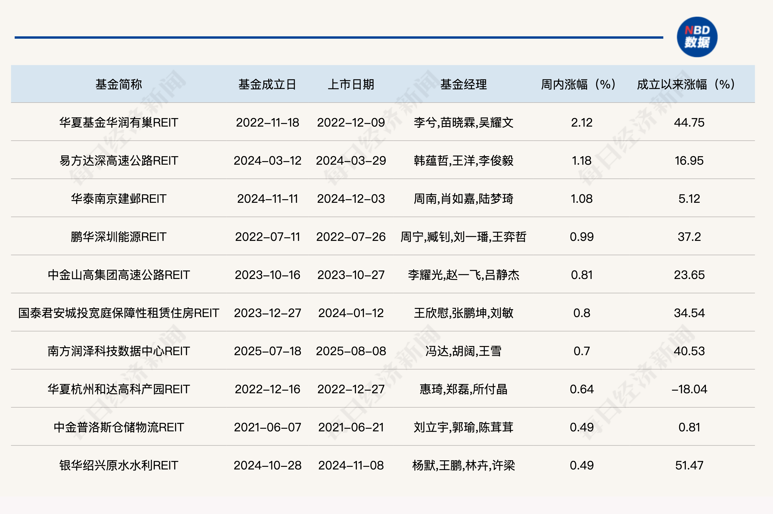 上周涨幅排名前十的公募REITs