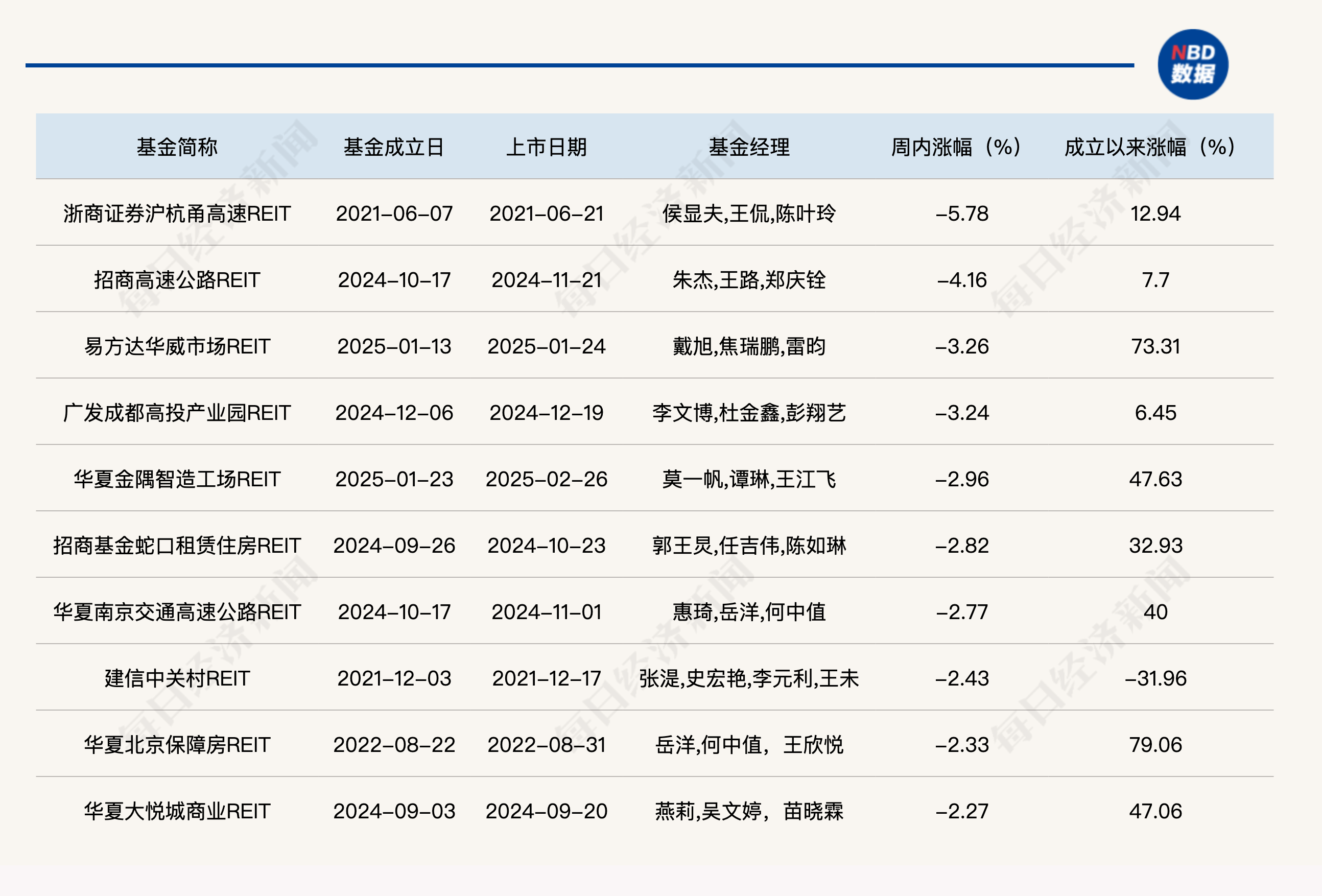 上周跌幅排名前十的公募REITs