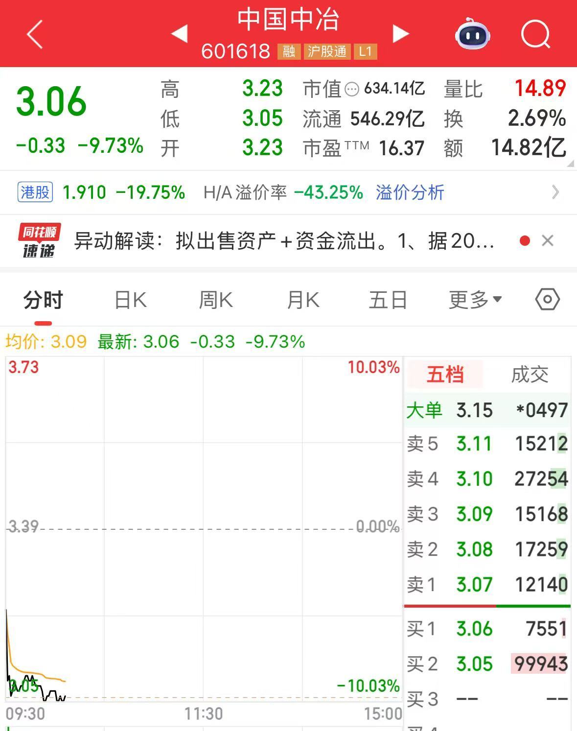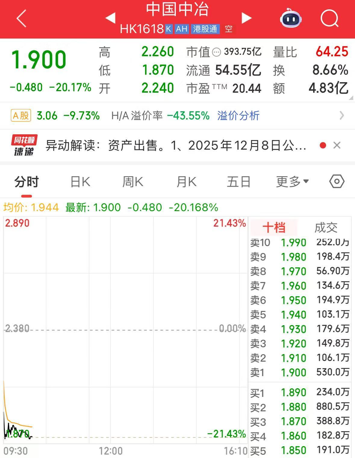 12月9日,中国中冶A股逼近跌停,港股跌超20%。