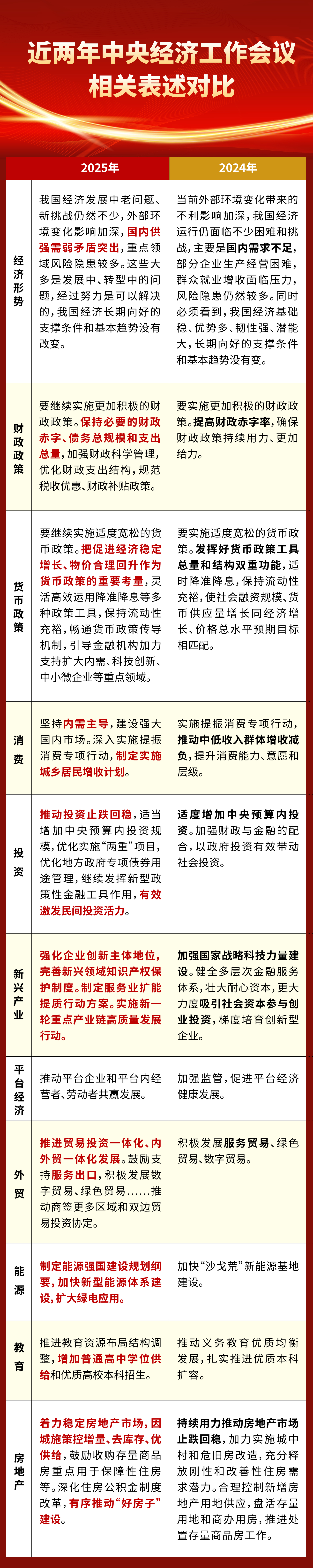 在具体行文中也有不少变化。例如:货币政策方面,从去年的“发挥好货币政策工具总量和结构双重功能”,调整为“把促进经济稳定增长、物价合理回升作为货币政策的重要考量”;在消费能力方面,从去年的“推动中低收入群体增收减负”,转变为明确提出要“制定实施城乡居民增收计划”;教育领域,新增强调“增加普通高中学位供给”;房地产领域,在控增量、去库存基础上,强调“优供给,鼓励收购存量商品房重点用于保障性住房等”;服务业方面,强调“制定服务业扩能提质行动方案”。