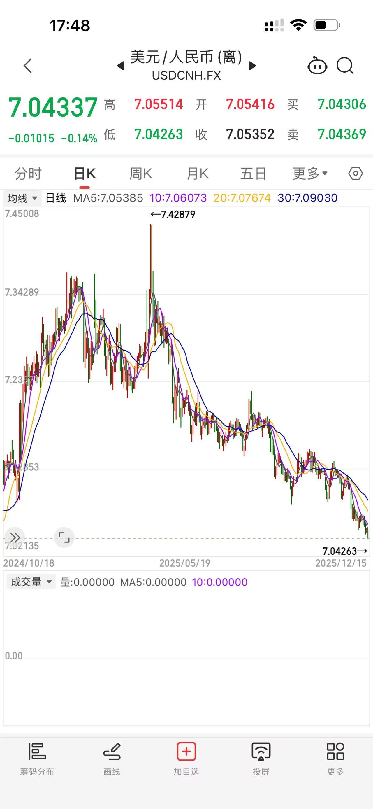 数据显示,15日午后,离岸人民币对美元汇率拉升,最高至7.0460,一举突破7.05,并创14个月新高。