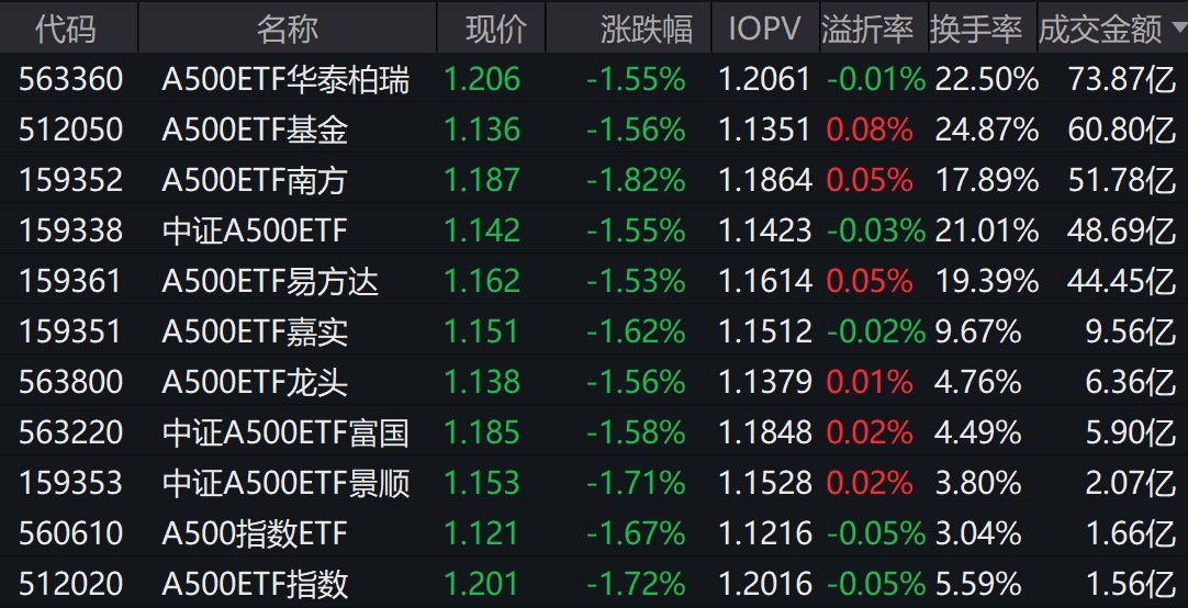 截至上午收盘,场内跟踪中证A500指数的ETF跌超1%。其中,有11只中证A500相关ETF成交额超1亿元,3只超51亿元。A500ETF华泰柏瑞、A500ETF基金、A500ETF南方早盘成交额分别为73.87亿元、60.8亿元、51.78亿元。