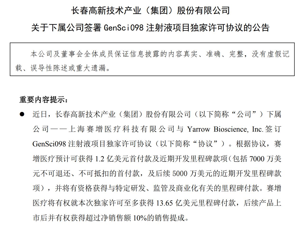 就在前一日(12月15日)晚,长春高新公告称,就GenSci098注射液项目,下属公司上海赛增医疗科技有限公司(以下简称“赛增医疗”)与Yarrow Bioscience, Inc.(以下简称“Yarrow”)签订独家许可协议,赛增医疗预计可获得1.2亿美元首付款及近期开发里程碑款项,其中7000万美元是不可退还、不可抵扣的首付款。此外,赛增医疗有权就本次独家许可至多获得13.65亿美元里程碑付款。