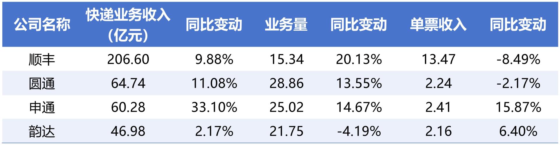 近日,A股四家快递公司顺丰控股(SZ002352)、圆通速递(SH600233)、申通快递(SZ002468)和韵达股份(SZ002120)披露11月月度经营情况。从具体数据看,顺丰业务量增速继续领跑,申通因并表丹鸟实现收入和业务量大幅增长,而韵达则成为“通达系”中唯一业务量同比下滑的公司。
