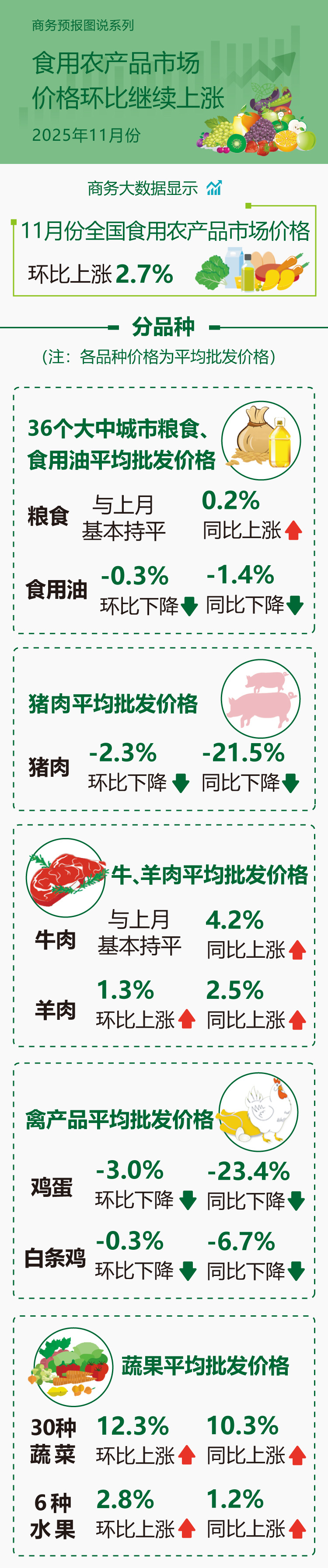 商务大数据显示,11月份全国食用农产品市场价格环比上涨2.7%,生产资料市场价格环比上涨1.3%。