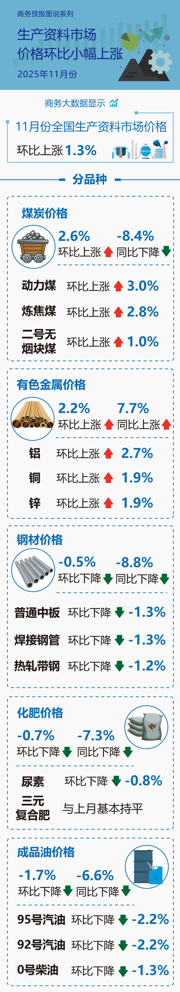 11月份,全国生产资料市场价格环比上涨1.3%。从主要品种来看,煤炭价格环比上涨2.6%,同比下降8.4%,其中,动力煤、炼焦煤、二号无烟块煤环比分别上涨3.0%、2.8%和1.0%。有色金属价格环比上涨2.2%,同比上涨7.7%,其中,铝、铜、锌环比分别上涨2.7%、1.9%和1.9%。钢材价格环比下降0.5%,同比下降8.8%,其中,普通中板、焊接钢管、热轧带钢环比分别下降1.3%、1.3%和1.2%。化肥价格环比下降0.7%,同比下降7.3%,其中,尿素环比下降0.8%,三元复合肥与上月基本持平。成品油价格环比下降1.7%,同比下降6.6%,其中,95号汽油、92号汽油、0号柴油环比分别下降2.2%、2.2%和1.3%。