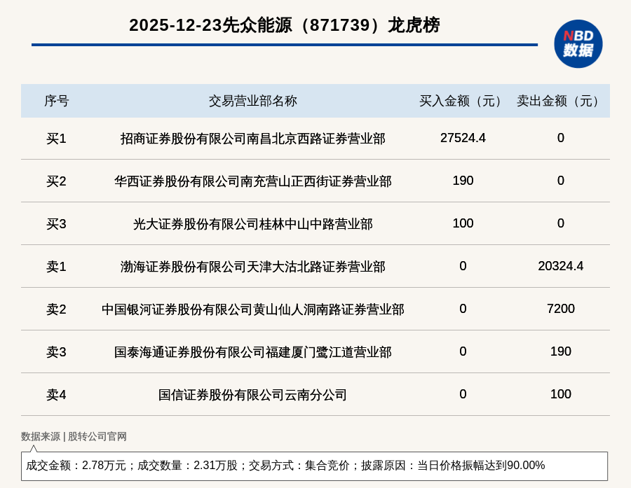 每经讯,2025年12月23日,新三板创新层公司先众能源(871739,收盘价:1.9元)登上龙虎榜,交易方式是集合竞价,披露原因是当日价格振幅达到90.00%,成交数量2.31万股,成交金额2.78万元。买一席位为招商证券股份有限公司南昌北京西路证券营业部,买入2.75万元;卖一席位为渤海证券股份有限公司天津大沽北路证券营业部,卖出2.03万元。