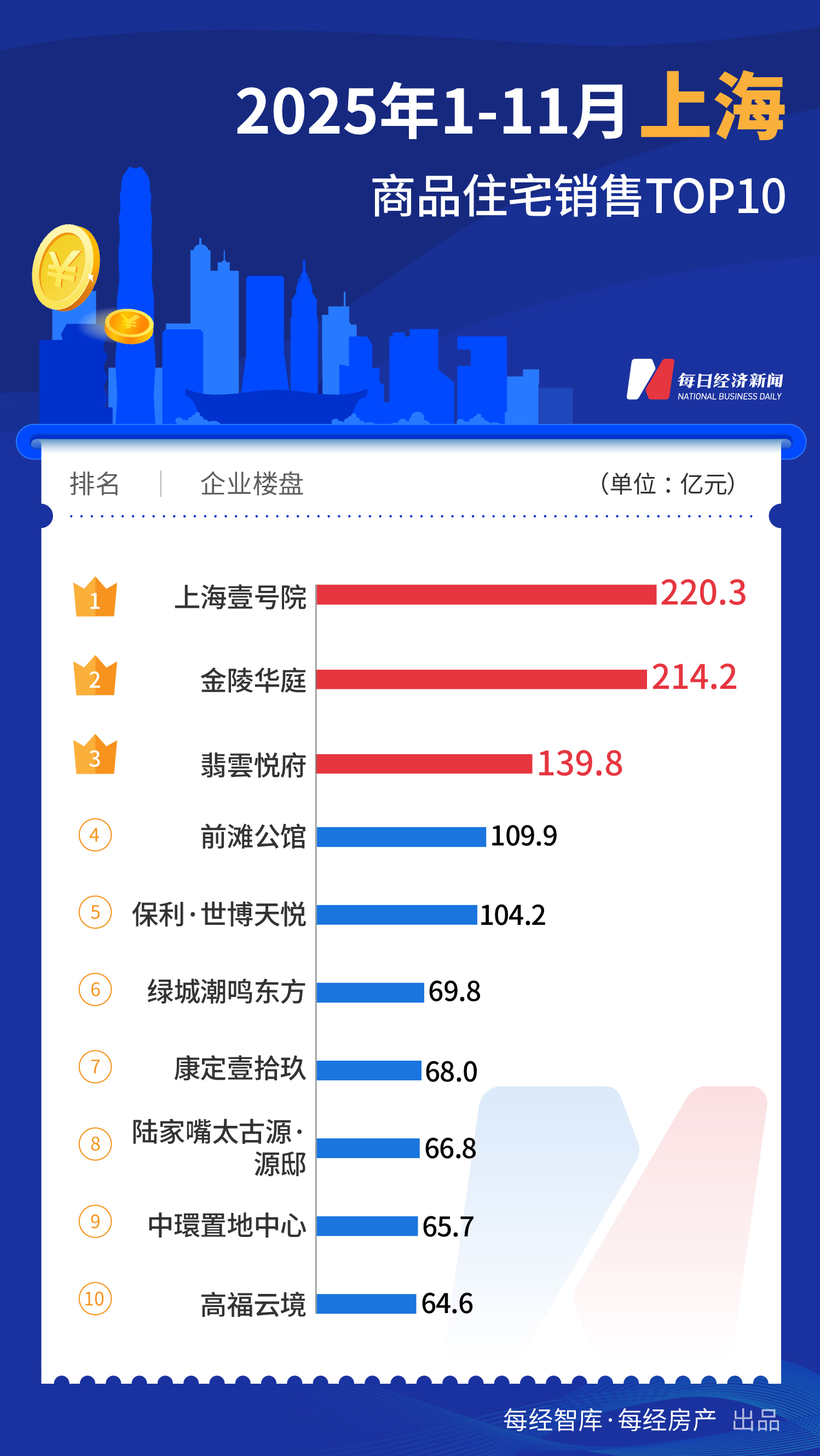 据中指研究院统计,1—11月,上海TOP10项目累计销售额合计1123.3亿元,继续断崖式领跑全国。
