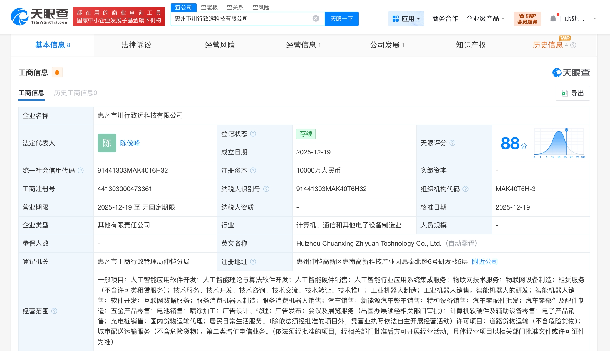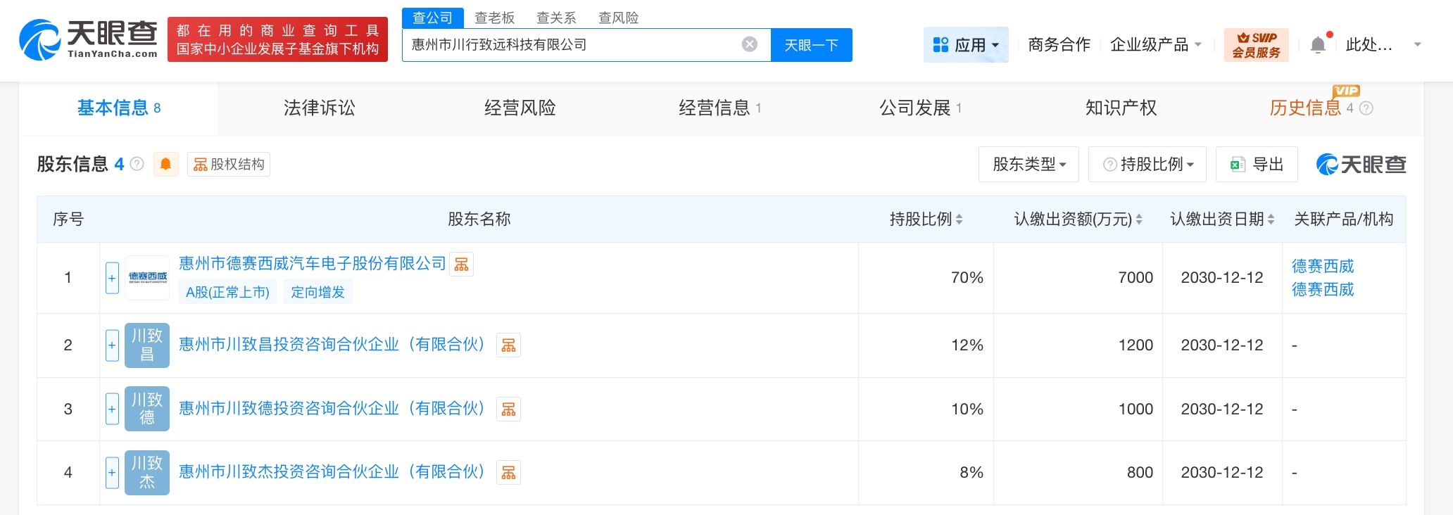 每经AI快讯,天眼查App显示,近日,惠州市川行致远科技有限公司成立,法定代表人为陈俊峰,注册资本1亿元人民币,经营范围含人工智能应用软件开发、人工智能理论与算法软件开发、人工智能硬件销售、人工智能行业应用系统集成服务、物联网技术服务、物联网设备制造、工业机器人制造、工业机器人销售、智能机器人的研发、新能源汽车整车销售等,由德赛西威(002920)、惠州市川致昌投资咨询合伙企业(有限合伙)、惠州市川致德投资咨询合伙企业(有限合伙)、惠州市川致杰投资咨询合伙企业(有限合伙)共同持股。