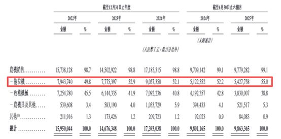 潍柴雷沃目前的产品组合主要包括智能农机和传统农机。按智能农机产品、传统农机产品及其他类别划分,潍柴雷沃2022年、2023年、2024年和2025年上半年(下称“报告期内”)的主要收入来源为“传统农机产品及其他”,收入占比分别为92.7%、87.5%、68.7%和50.3%,呈逐年/期下滑的趋势。同期内,公司智能农业机械产品的收入占比则从7.3%一路升至49.7%。