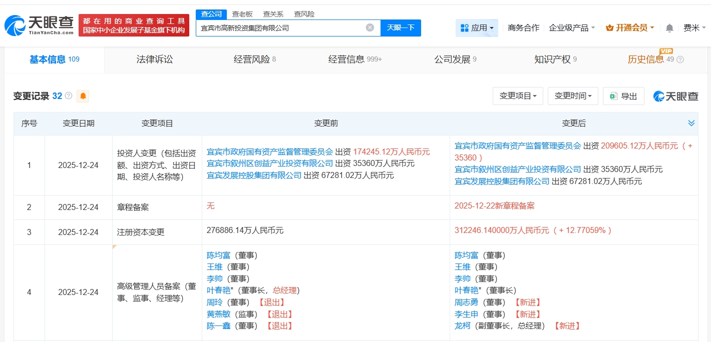 每经AI快讯,天眼查App显示,近日,宜宾市高新投资集团有限公司发生工商变更,注册资本由约27.7亿元人民币增至约31.2亿元人民币,增幅约13%,同时多位高管发生变更。该公司成立于2022年11月,法定代表人为叶春艳,经营范围包括自有资金投资的资产管理服务、融资咨询服务、园区管理服务、工程管理服务等,由宜宾市政府国有资产监督管理委员会、宜宾发展控股集团有限公司、宜宾市叙州区创益产业投资有限公司共同持股。