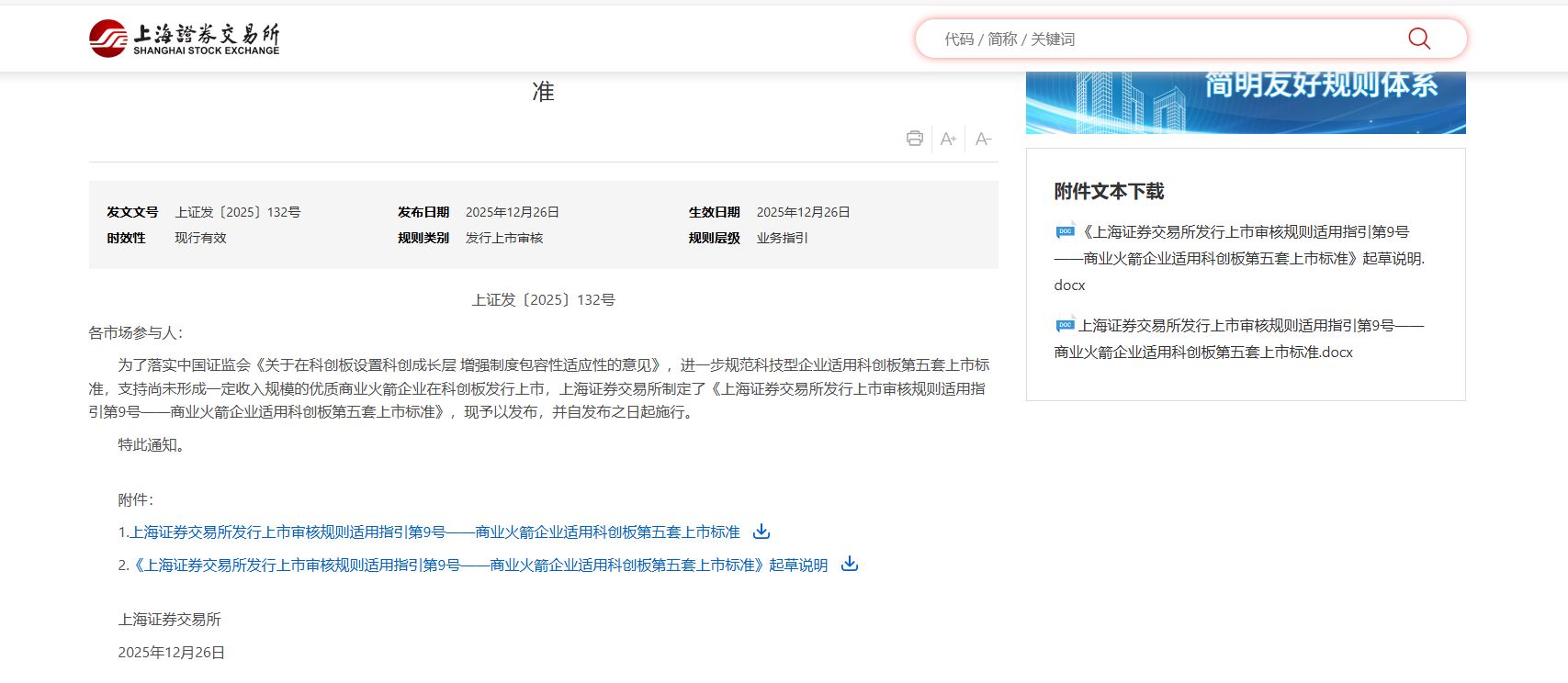 12月26日,上交所发布《上海证券交易所发行上市审核规则适用指引第9号——商业火箭企业适用科创板第五套上市标准》(下称《指引》),旨在推进科创板第五套上市标准在商业航天等领域扩围工作,加快推进商业航天创新发展、主动服务航天强国战略。