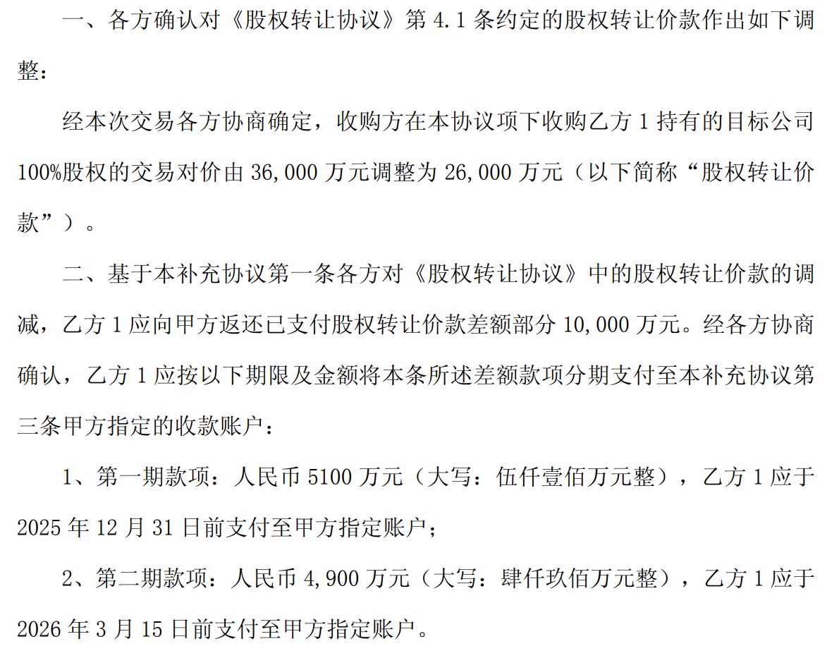而这次签署的补充协议显示,交易对价调整后,丝宝股份需向豪悦护理返还已支付的股权转让价款差额1亿元,返还方式分两期执行。第一期款项5100万元需在今年12月31日前支付至豪悦护理指定账户,第二期4900万元则需在2026年3月15日前完成支付。