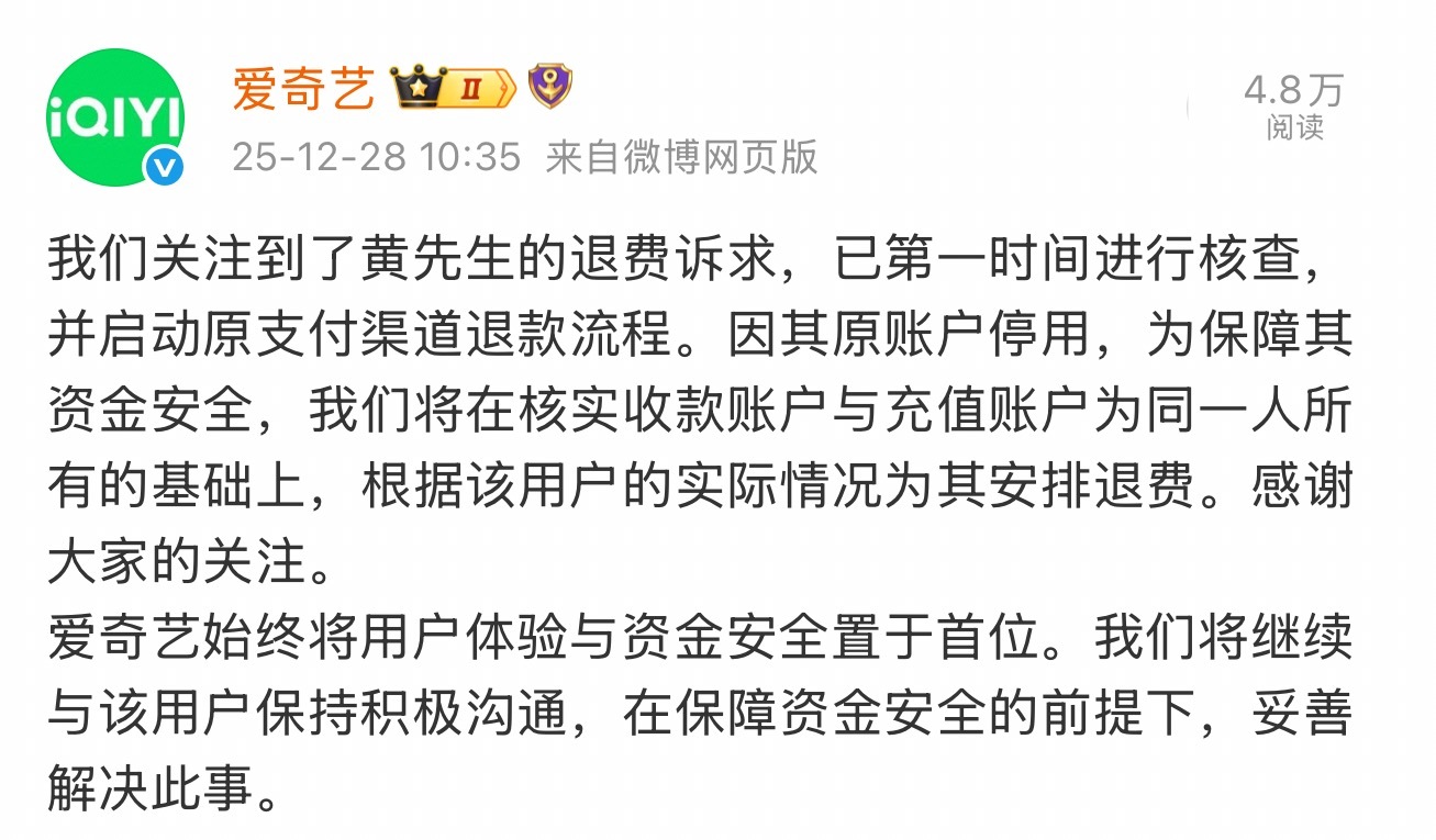12月28日,爱奇艺发布回应表示:我们关注到了黄先生的退费诉求,已第一时间进行核查,并启动原支付渠道退款流程。因其原账户停用,为保障其资金安全,我们将在核实收款账户与充值账户为同一人所有的基础上,根据该用户的实际情况为其安排退费。感谢大家的关注。爱奇艺始终将用户体验与资金安全置于首位。我们将继续与该用户保持积极沟通,在保障资金安全的前提下,妥善解决此事。