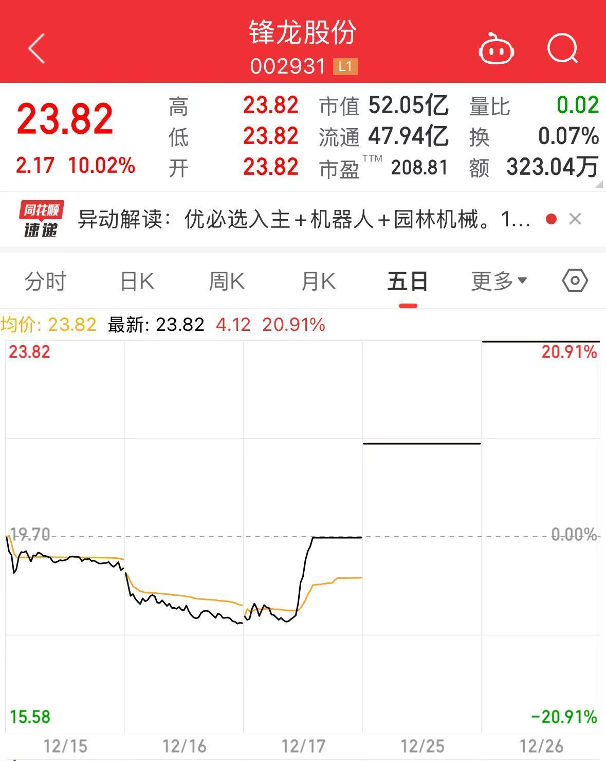值得注意的是,锋龙股份已经三连板,停牌前涨停,复牌后连续无量涨停,累计涨幅达33.15%。