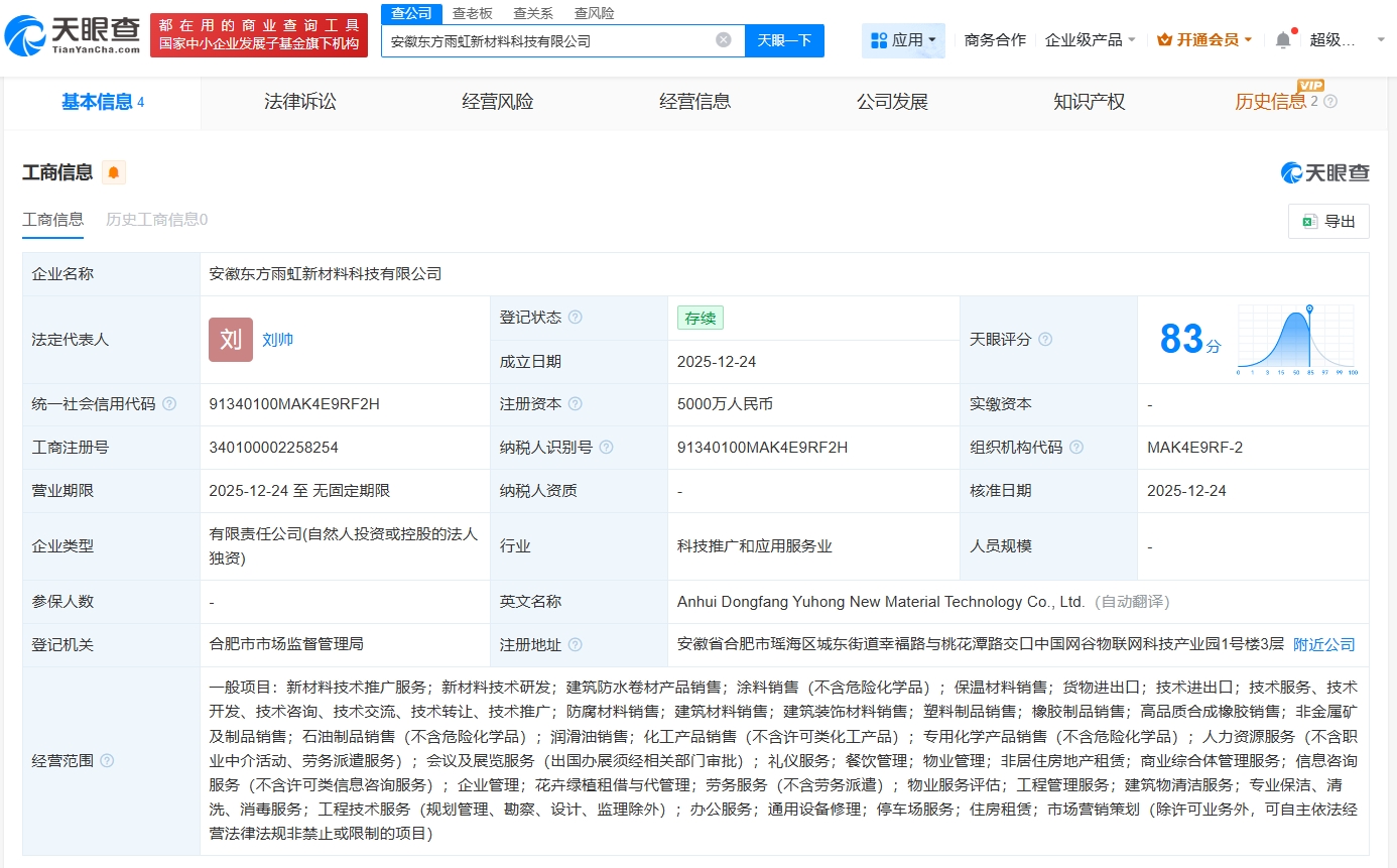 每经AI快讯,天眼查工商信息显示,近日,安徽东方雨虹新材料科技有限公司成立,法定代表人为刘帅,注册资本5000万元人民币,经营范围包括新材料技术推广服务、新材料技术研发、建筑防水卷材产品销售、防腐材料销售、建筑材料销售等。股东信息显示,该公司由上海东方雨虹防水技术有限责任公司全资持股。