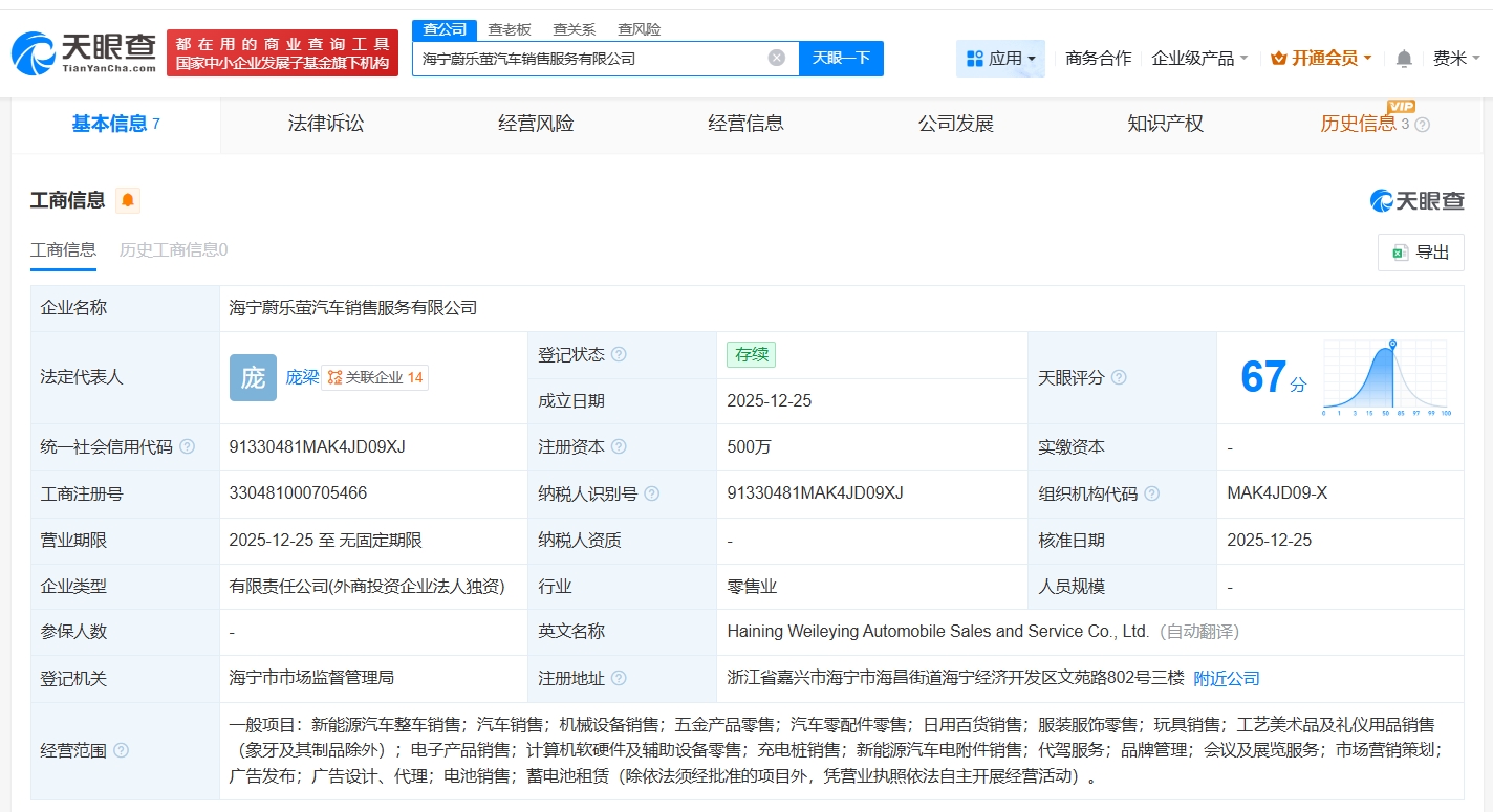 每经AI快讯,天眼查App显示,近日,海宁蔚乐萤汽车销售服务有限公司成立,法定代表人为庞梁,注册资本500万元,经营范围包括新能源汽车整车销售、机械设备销售、五金产品零售等,由蔚来汽车销售服务有限公司全资持股。