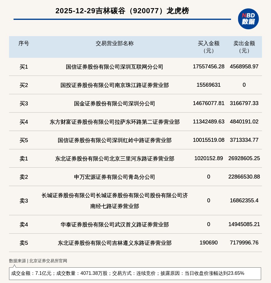 每经讯,2025年12月29日,北交所上市公司吉林碳谷(920077,收盘价:18.3元)登上龙虎榜,交易方式是连续竞价,披露原因是当日收盘价涨幅达到23.65%,成交数量4071.38万股,成交金额7.1亿元。买一席位为国信证券股份有限公司深圳互联网分公司,买入1755.75万元;卖一席位为东北证券股份有限公司北京三里河东路证券营业部,卖出2692.86万元。