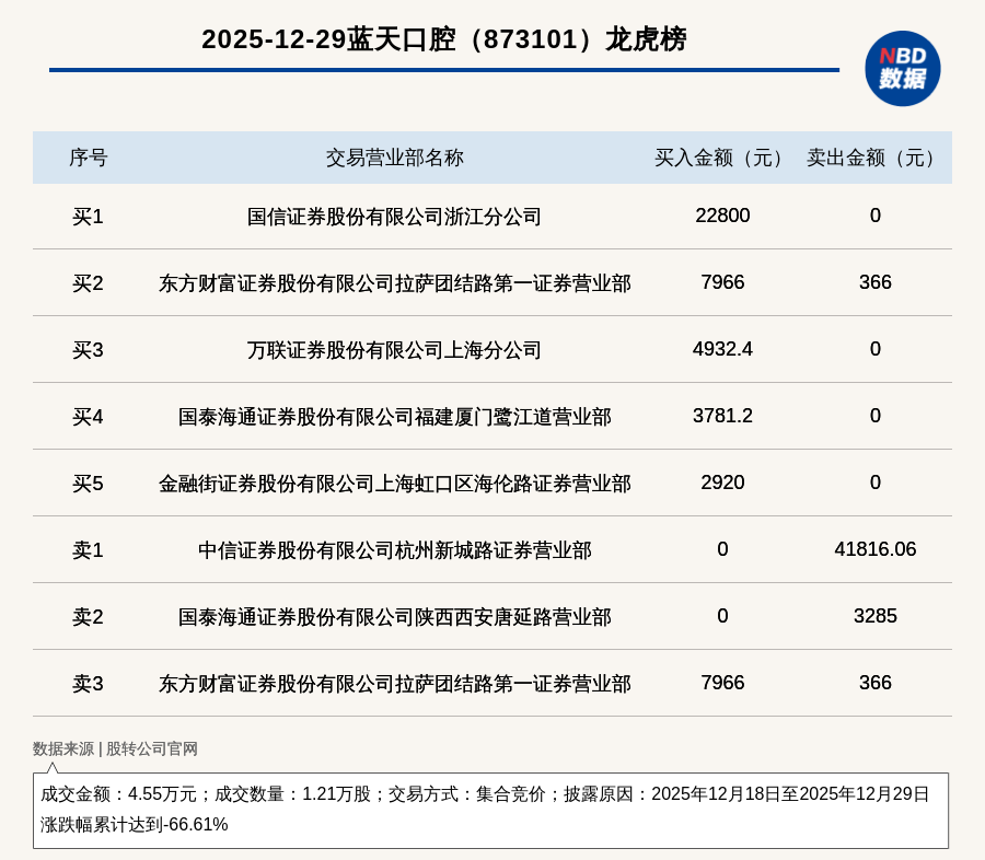 每经讯,2025年12月29日,新三板创新层公司蓝天口腔(873101,收盘价:1.83元)登上龙虎榜,交易方式是集合竞价,披露原因是2025年12月18日至2025年12月29日涨跌幅累计达到-66.61%,成交数量1.21万股,成交金额4.55万元。买一席位为国信证券股份有限公司浙江分公司,买入2.28万元;卖一席位为中信证券股份有限公司杭州新城路证券营业部,卖出4.18万元。