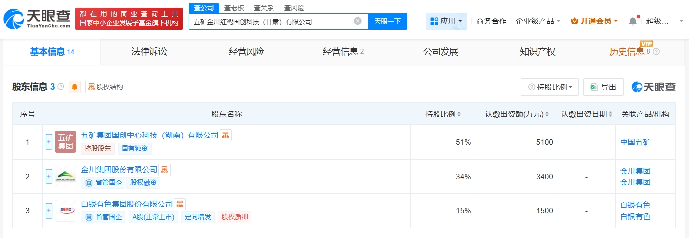 每经AI快讯,天眼查App显示,近日,五矿金川红鹭国创科技(甘肃)有限公司成立,法定代表人为李向东,注册资本1亿元人民币,经营范围包括金属与非金属矿产资源地质勘探、矿产资源勘查、地质灾害治理工程勘查、地质灾害危险性评估等。股东信息显示,该公司由五矿集团国创中心科技(湖南)有限公司、金川集团股份有限公司、白银有色(601212)共同持股。