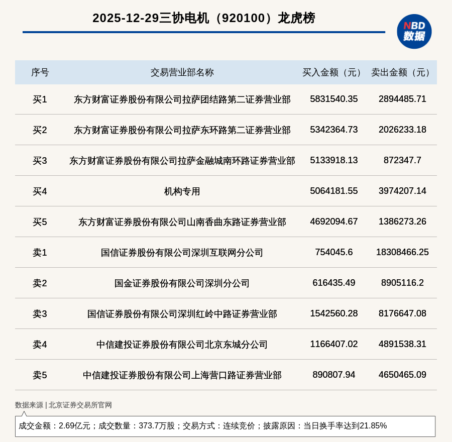 每经讯,2025年12月29日,北交所上市公司三协电机(920100,收盘价:71.1元)登上龙虎榜,交易方式是连续竞价,披露原因是当日换手率达到21.85%,成交数量373.7万股,成交金额2.69亿元。买一席位为东方财富证券股份有限公司拉萨团结路第二证券营业部,买入583.15万元;卖一席位为国信证券股份有限公司深圳互联网分公司,卖出1830.85万元。