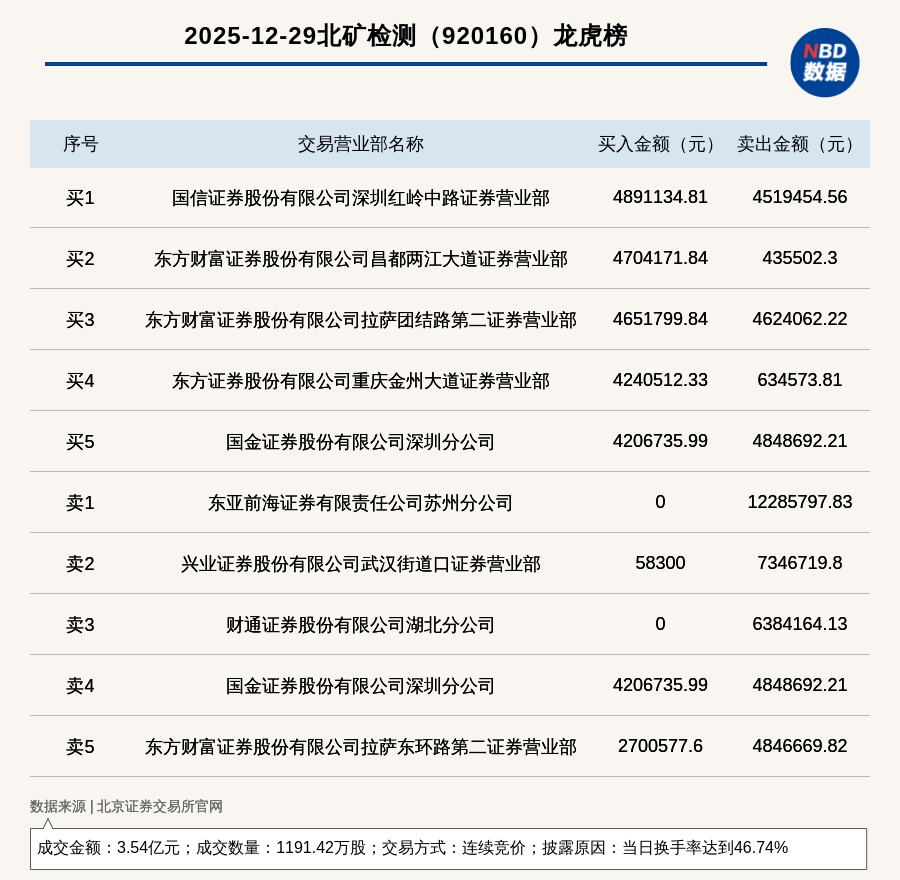 每经讯,2025年12月29日,北交所上市公司北矿检测(920160,收盘价:28.01元)登上龙虎榜,交易方式是连续竞价,披露原因是当日换手率达到46.74%,成交数量1191.42万股,成交金额3.54亿元。买一席位为国信证券股份有限公司深圳红岭中路证券营业部,买入489.11万元;卖一席位为东亚前海证券有限责任公司苏州分公司,卖出1228.58万元。