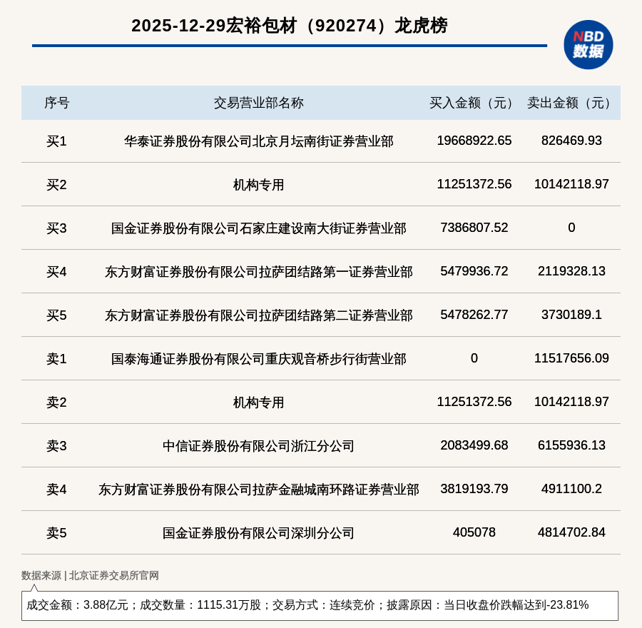 每经讯,2025年12月29日,北交所上市公司宏裕包材(920274,收盘价:32.23元)登上龙虎榜,交易方式是连续竞价,披露原因是当日收盘价跌幅达到-23.81%,成交数量1115.31万股,成交金额3.88亿元。买一席位为华泰证券股份有限公司北京月坛南街证券营业部,买入1966.89万元;卖一席位为国泰海通证券股份有限公司重庆观音桥步行街营业部,卖出1151.77万元。