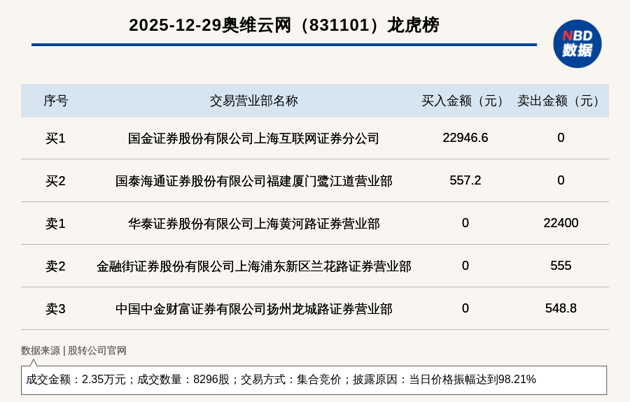 每经讯,2025年12月29日,新三板基础层公司奥维云网(831101,收盘价:2.8元)登上龙虎榜,交易方式是集合竞价,披露原因是当日价格振幅达到98.21%,成交数量8296股,成交金额2.35万元。买一席位为国金证券股份有限公司上海互联网证券分公司,买入2.29万元;卖一席位为华泰证券股份有限公司上海黄河路证券营业部,卖出2.24万元。