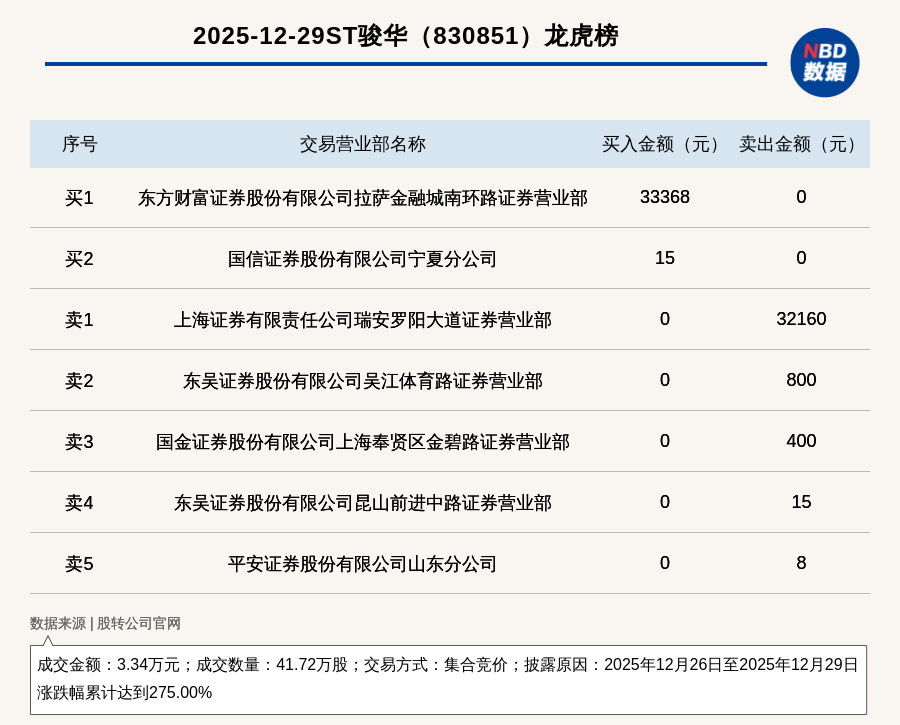 每经讯,2025年12月29日,新三板基础层公司ST骏华(830851,收盘价:0.15元)登上龙虎榜,交易方式是集合竞价,披露原因是2025年12月26日至2025年12月29日涨跌幅累计达到275.00%,成交数量41.72万股,成交金额3.34万元。买一席位为东方财富证券股份有限公司拉萨金融城南环路证券营业部,买入3.34万元;卖一席位为上海证券有限责任公司瑞安罗阳大道证券营业部,卖出3.22万元。