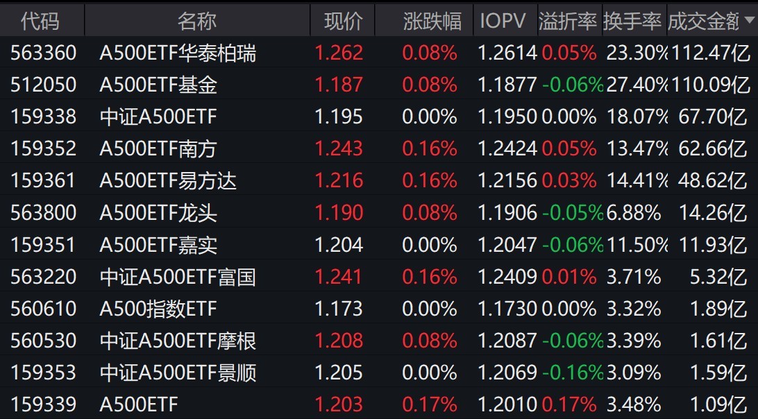 截至上午收盘,场内多只跟踪中证A500指数的ETF小幅上涨。其中,有12只中证A500相关ETF成交额超1亿元,2只超110亿元。A500ETF华泰柏瑞、A500ETF基金早盘成交额分别为112.47亿元、110.09亿元。