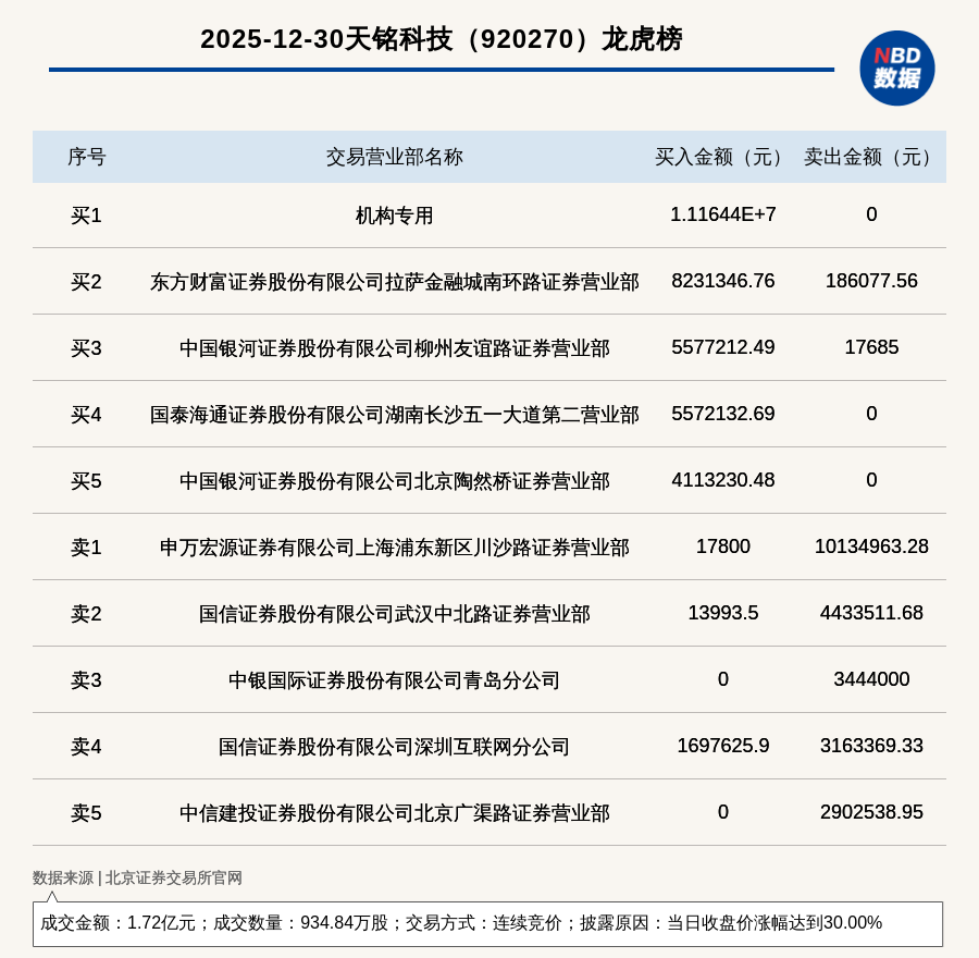 每经讯,2025年12月30日,北交所上市公司天铭科技(920270,收盘价:19.76元)登上龙虎榜,交易方式是连续竞价,披露原因是当日收盘价涨幅达到30.00%,成交数量934.84万股,成交金额1.72亿元。买一席位为机构专用,买入1116.44万元;卖一席位为申万宏源证券有限公司上海浦东新区川沙路证券营业部,卖出1013.5万元。