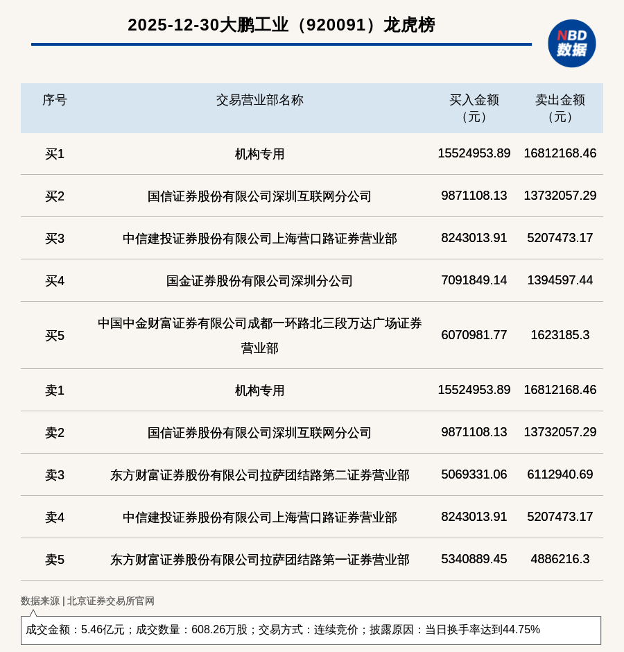 每经讯,2025年12月30日,北交所上市公司大鹏工业(920091,收盘价:91.5元)登上龙虎榜,交易方式是连续竞价,披露原因是当日换手率达到44.75%,成交数量608.26万股,成交金额5.46亿元。买一席位为机构专用,买入1552.5万元;卖一席位为机构专用,卖出1681.22万元。