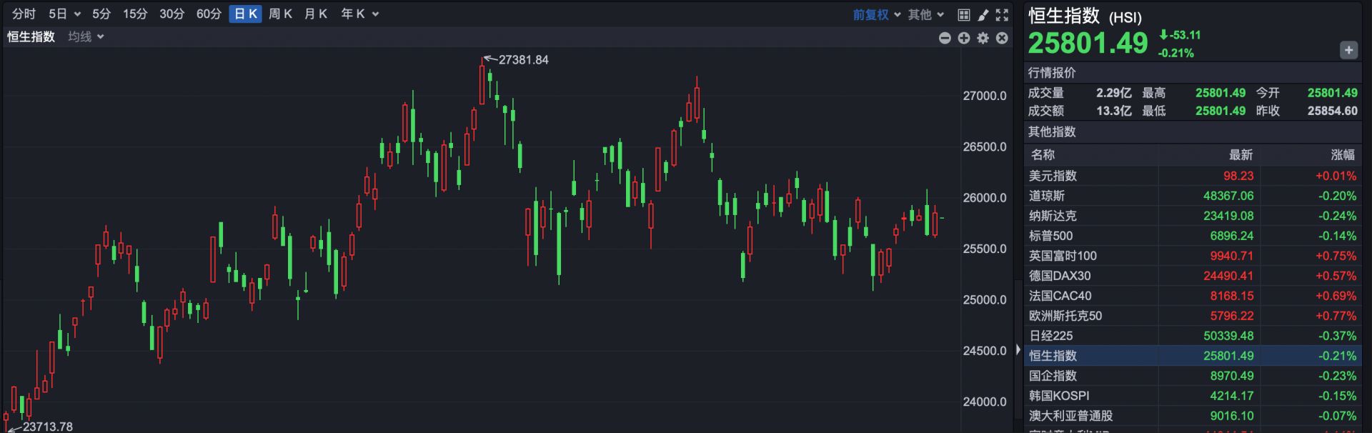 截至发稿,恒生指数报25801.49点,低开53.11点,跌幅0.21%。