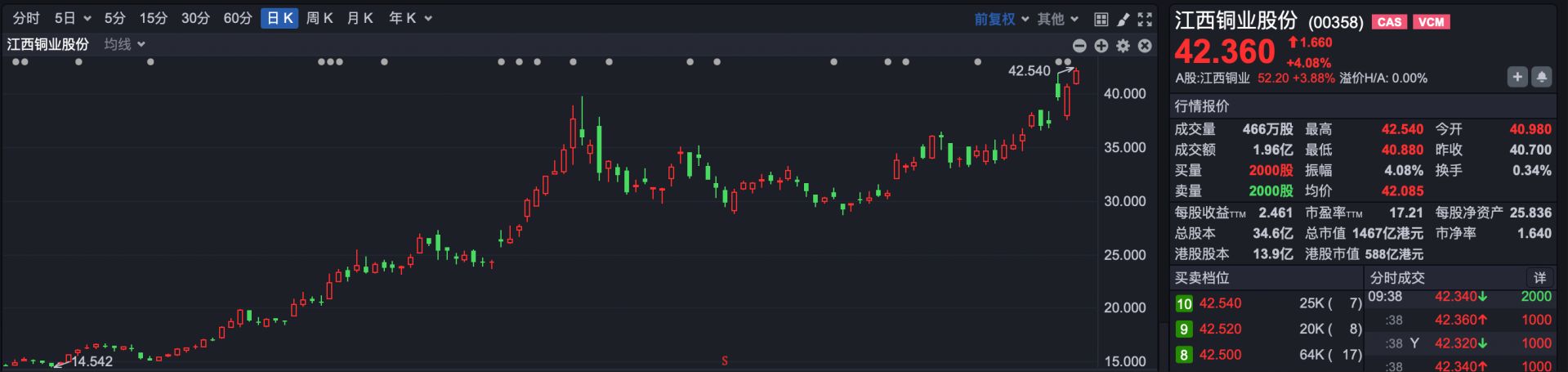 盘面上,有色金属板块普涨。其中,江西铜业股份(HK00358)涨超4%,创出历史新高。此外,五矿资源涨超3%,洛阳钼业、中国有色矿业、紫金黄金国际涨超2%。