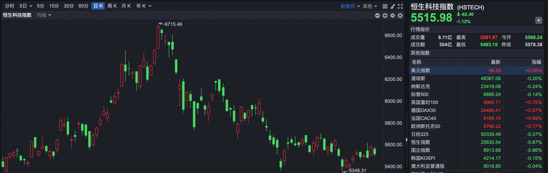恒生科技指数报收于5514.98点,下跌62.40点,跌幅1.12%。