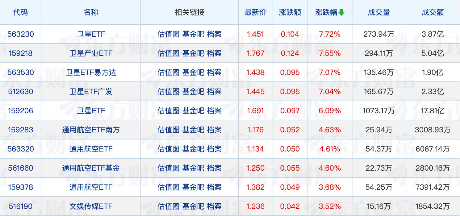 12月31日,卫星ETF全线走强,最高涨7.72%。