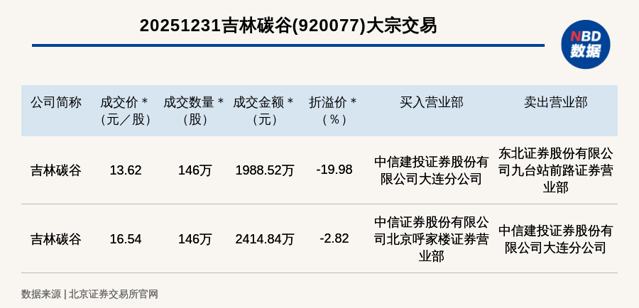 每经讯,2025年12月31日,北交所上市公司吉林碳谷(920077,收盘价:17.02元)发生2笔大宗交易,折价率最高的一笔成交价13.62元/股,成交数量146万股,成交金额1988.52万元,折价19.98%。买入营业部是中信建投证券股份有限公司大连分公司,卖出营业部是东北证券股份有限公司九台站前路证券营业部。