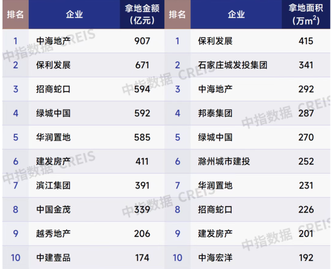 保利发展、华润置地、中海地产、招商蛇口、建发房产等8家房企拿地金额均超300亿元。