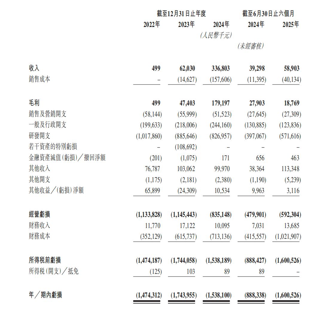 报告期内,壁仞科技收入大幅增长,2022年仅为49.9万元,2023年飙升至6203万元,2024年进一步飙升至近3.37亿元。