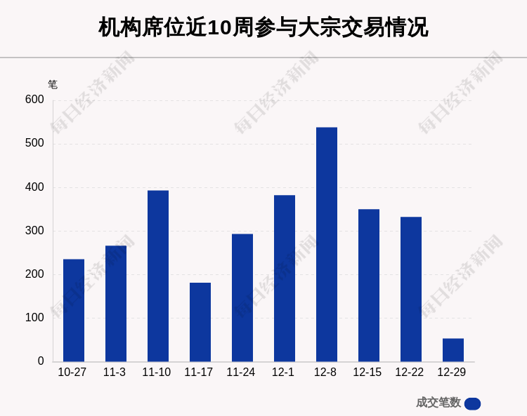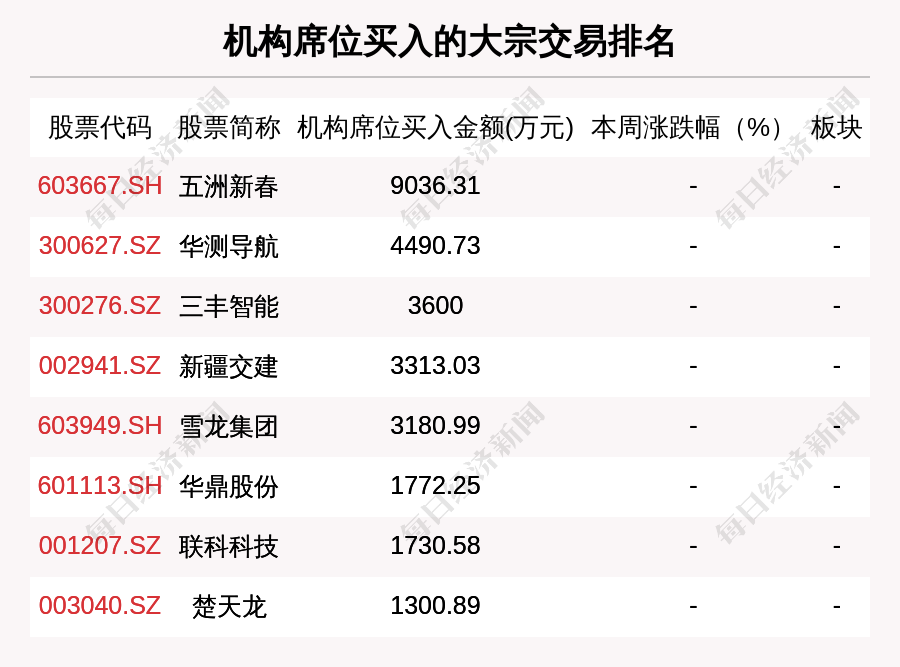 本周机构专用席位参与了53笔大宗交易,环比上周减少279笔。本周机构席位买入金额前3的公司为五洲新春、华测导航、三丰智能,机构买入金额分别为9036.31万元、4490.73万元、3600万元。