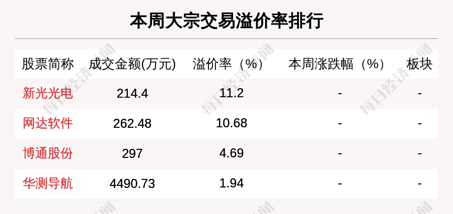 溢价交易方面,本周有2笔大宗交易溢价率超过10%。