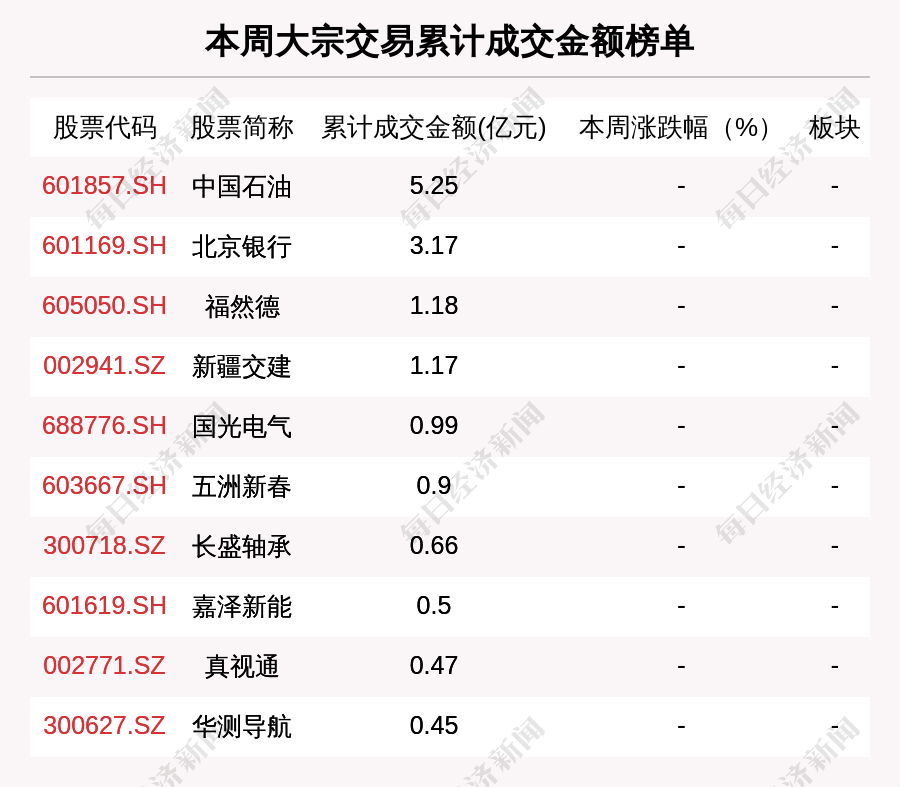 本周大宗交易累计成交金额前3的公司是中国石油、北京银行、福然德,累计成交金额分别为5.25亿元,3.17亿元,1.18亿元。