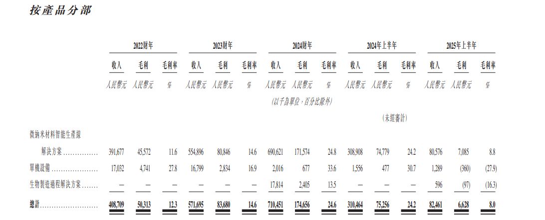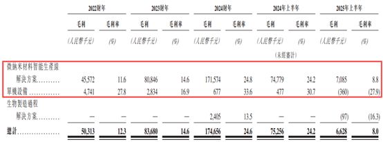 值得注意的是,微纳米材料智能生产线解决方案的毛利率在报告期内呈波动态势。例如,该业务在2024年上半年毛利率曾达到24.2%,但2025年上半年却大幅下滑了15.4个百分点至8.8%。