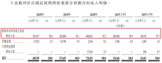 琥崧科技的业务运营围绕三大核心业务开展,分别为微纳米材料智能生产线解决方案、单机设备和生物制造过程解决方案。具体来看,2022年、2023年、2024年和2025年上半年(以下简称报告期内),琥崧科技的绝大部分收入均来自微纳米材料智能生产线解决方案,收入占比分别为95.8%、97.1%、97.2%和97.7%。