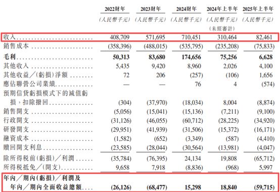 业绩方面,报告期内,琥崧科技的收入分别为4.09亿元、5.72亿元、7.1亿元和8246.1万元。同期,公司年/期内利润分别为-2612.6万元、-6847.7万元、1529.8万元和-5971.5万元。