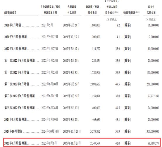 历史上,琥崧科技经历了多轮增资和股份转让。就在递表前约一个月(2025年11月27日),公司完成一次股份转让,5名股东以42元/股的价格合计转让约234.76万股,套现9870.83万元。