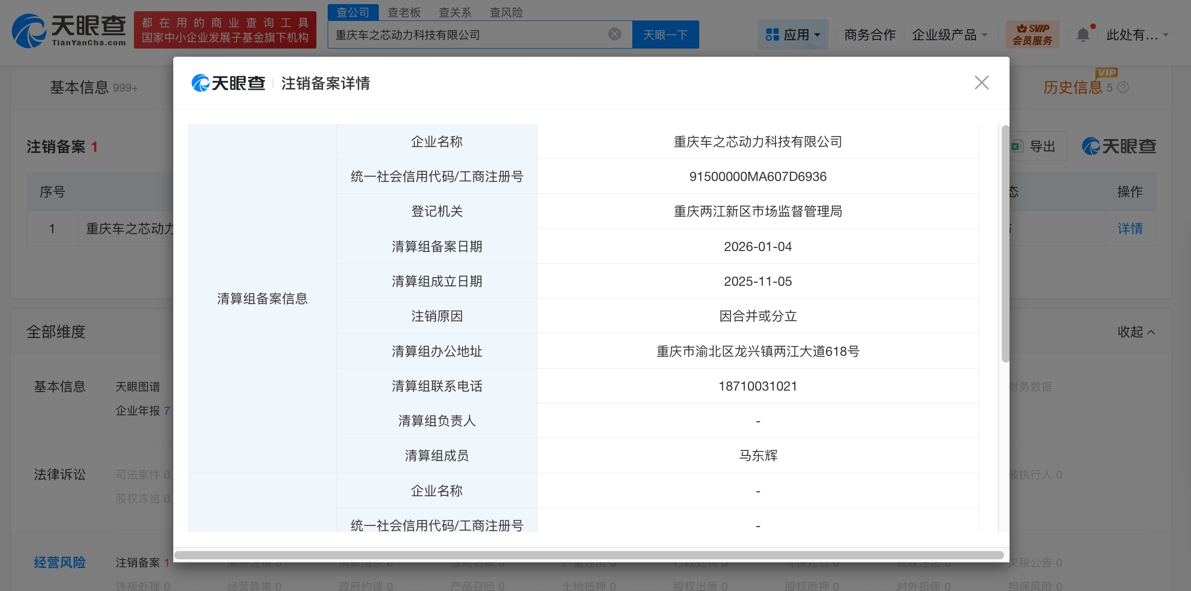 每经AI快讯,天眼查App显示,近日,重庆车之芯动力科技有限公司新增一则注销备案公告,注销原因为因合并或分立。该公司成立于2018年12月,法定代表人为马东辉,注册资本8000万元人民币,经营范围为从事动力科技、新能源领域内的技术开发、技术咨询、技术转让、技术服务,新能源汽车、摩托车、电池、充电桩、电子产品、电源及其零部件的研发、生产、销售及维护,货物及技术进出口。股东信息显示,该公司由理想汽车旗下江苏心电互动汽车销售服务有限公司全资持股。