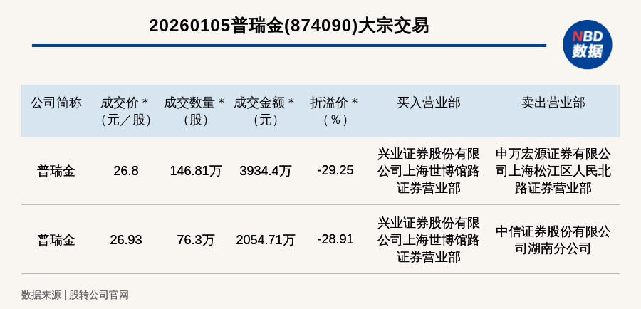 每经讯,2026年1月5日,新三板创新层公司普瑞金(874090,收盘价:37.88元)发生2笔大宗交易,总成交金额为5989.11万元,成交金额最高的一笔成交价26.8元/股,成交数量146.81万股,成交金额3934.4万元,折价29.25%。买入营业部是兴业证券股份有限公司上海世博馆路证券营业部,卖出营业部是申万宏源证券有限公司上海松江区人民北路证券营业部。